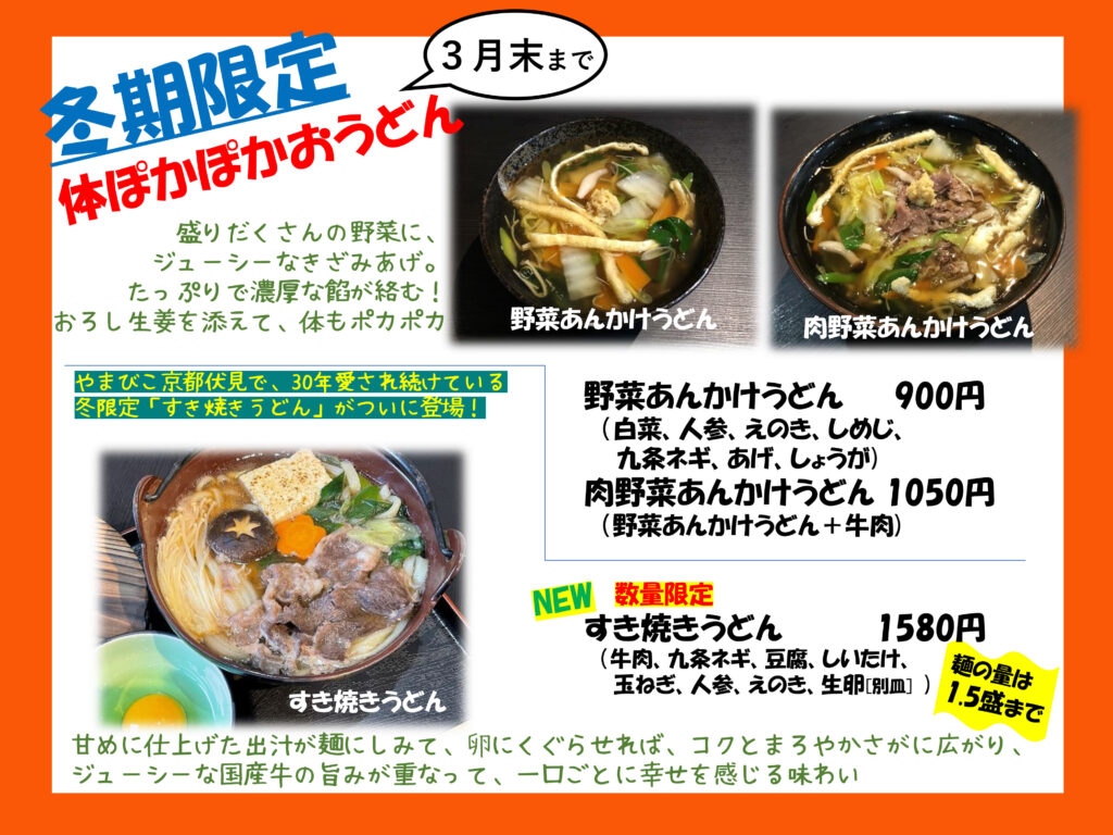 盛りだくさんの野菜、きざみあげが入った「野菜あんかけうどん」 お肉も入った、がっつり満足の「肉野菜あんかけうどん」 そして今年から仲間入り「すき焼きうどん」 ぜひ冬の寒い季節にお試しあれ!