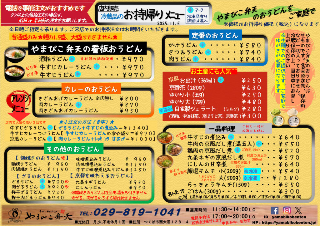 おうどん、一品料理の一覧メニュー ※おしながき→全品ボタンで、大きく見れます